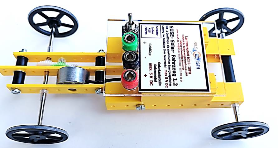 Die beiden Superkondensatoren sind die elektrischen Energiespeicher des Fahrzeugs, aus ihm bezieht der Elektromotor die Energie zum Fahren, dabei entladen sich die Kondensatoren. Bei realen Elektrofahrzeugen wird ein Akku verwendet. Vorteil des Superkondensators ist die schnelle Ladung, bei strahlendem Sonnenschein dauert die Aufladung mit einem Solarmodul (= Solartankstelle) nur ca. 1- 2 Minuten. Im Gegensatz zum Akku benötigt der Superkondensator auch keine Ladeelektronik mit bestimmten Ladestromstärken. Die Reichweite des Fahrzeugs bei voll aufgeladenem Superkondensator und glatter Fahrbahn ist ca. 100 m. Bei bedecktem Himmel oder geringer Strahlung dauert das Aufladen länger, die Aufladung kann mit einem Voltmeter beobachtet/gemessen werden. Im Innenraum kann das Solarmodul vor einem Halogenstrahler, einer Rotlichtlampe oder auf der Platte eines Overheadprojektors positioniert werden.