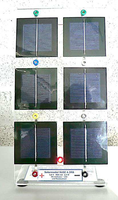 Das Solarmodul SUSE 4.3RB ist ein hochwertiges 3,9 V – 1,025 A – 3,2 W - Solarmodul auf einem stabilen Plexiglasträger (480x160x6 mm) mit 6 Solarzellen SUSEmod218 in interner Reihenschaltung mit 8 Mess- /Anschlussbuchsen (+ Verbindungsstecker mit Buchse bei 4.3RB33) In der Reihenschaltung liefert das Modul (bei 1000 W/m²) eine Spannung von 3,9 V, eine Stromstärke von 1,025 A und eine Leistung von 3,2 W. Jede Solarzelle hat ein eigenes Buchsenpaar für elektrische Messungen, am rot- schwarzen Buchsenpaar steht die Gesamtspannung zur Verfügung. Zur weiteren Erhöhung der Spannung lassen sich auch mehrere Module in Reihe schalten. Das Modul besitzt eine Indikator- LED, welche die Betriebsbereitschaft anzeigt. Die Indikator- LED leuchtet bereits im Innenraum hell auf und signalisiert so die Energiebereitschaft. Die 6 Buchsenpaare, 2 an jeder Solarzelle, sind farblich gekennzeichnet und bilden die elektrischen Anschlüsse für jede einzelne Solarzelle. Mit diesem Modul können elektrische Geräte (Radio, Solarfahrzeuge….) betrieben werden, die für 3- 4 V DC ausgelegt sind, es lassen sich mit der umfangreichen Experimentieranleitung zu SUSE 4.3RB viele Experimente zur Solarzelle und Photovoltaik- Systemtechnik durchführen:
